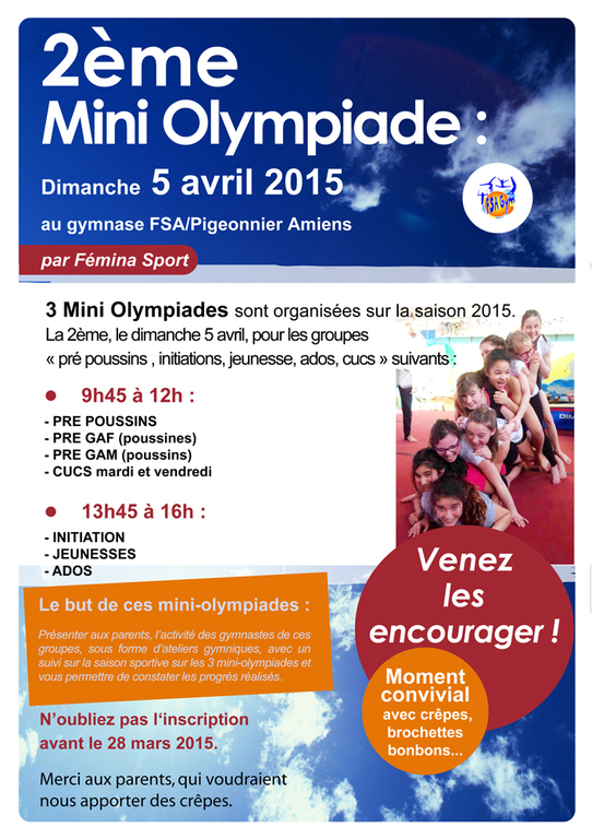 Le DIMANCHE 5 avril 2015 se déroulera la première mini-olympiade de la saison 2014/2015 !