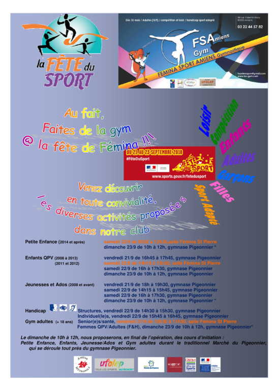 Fémina Sport Amiens ouvrira ses portes les 21, 22 et 23 septembre 2018 dans le cadre de la Fête du Sport, sur les 2 salles d'entraînement.