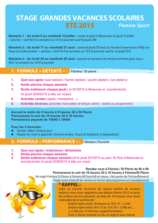 les stages d'été avec 2 semaines avec SORTIE EXTERIEURE et dernière semaine SUPER REMISE EN FORME pour la rentrée;